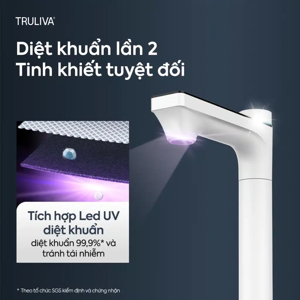 Vòi UV thông minh bảo vệ kép (*): Vòi tích hợp đèn UV diệt khuẩn 99% lần cuối trước khi nước ra khỏi vòi, đồng thời hiển thị cảnh báo thay lọc và chất lượng nước sau lọc (TDS), giúp người dùng an tâm tuyệt đối.